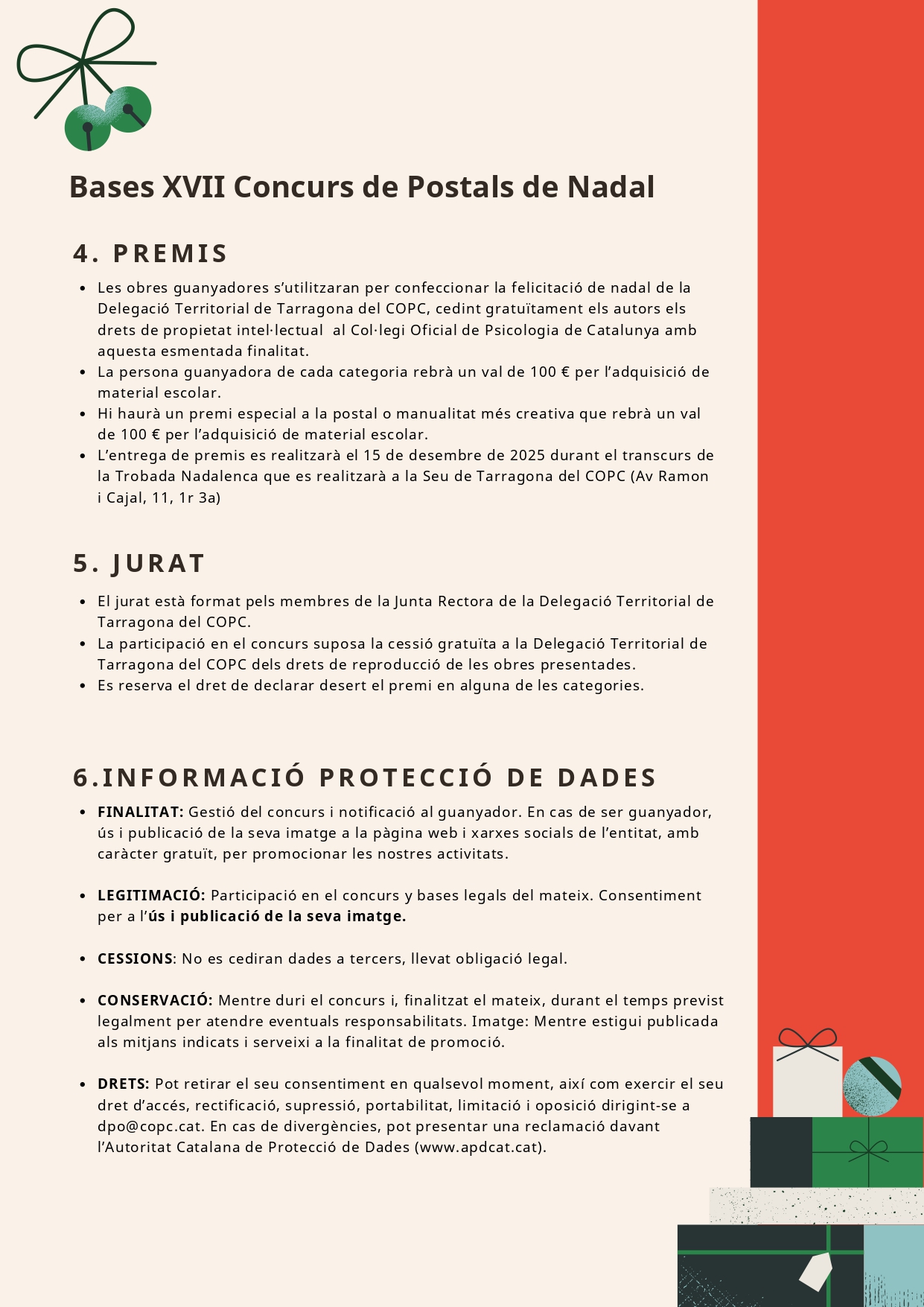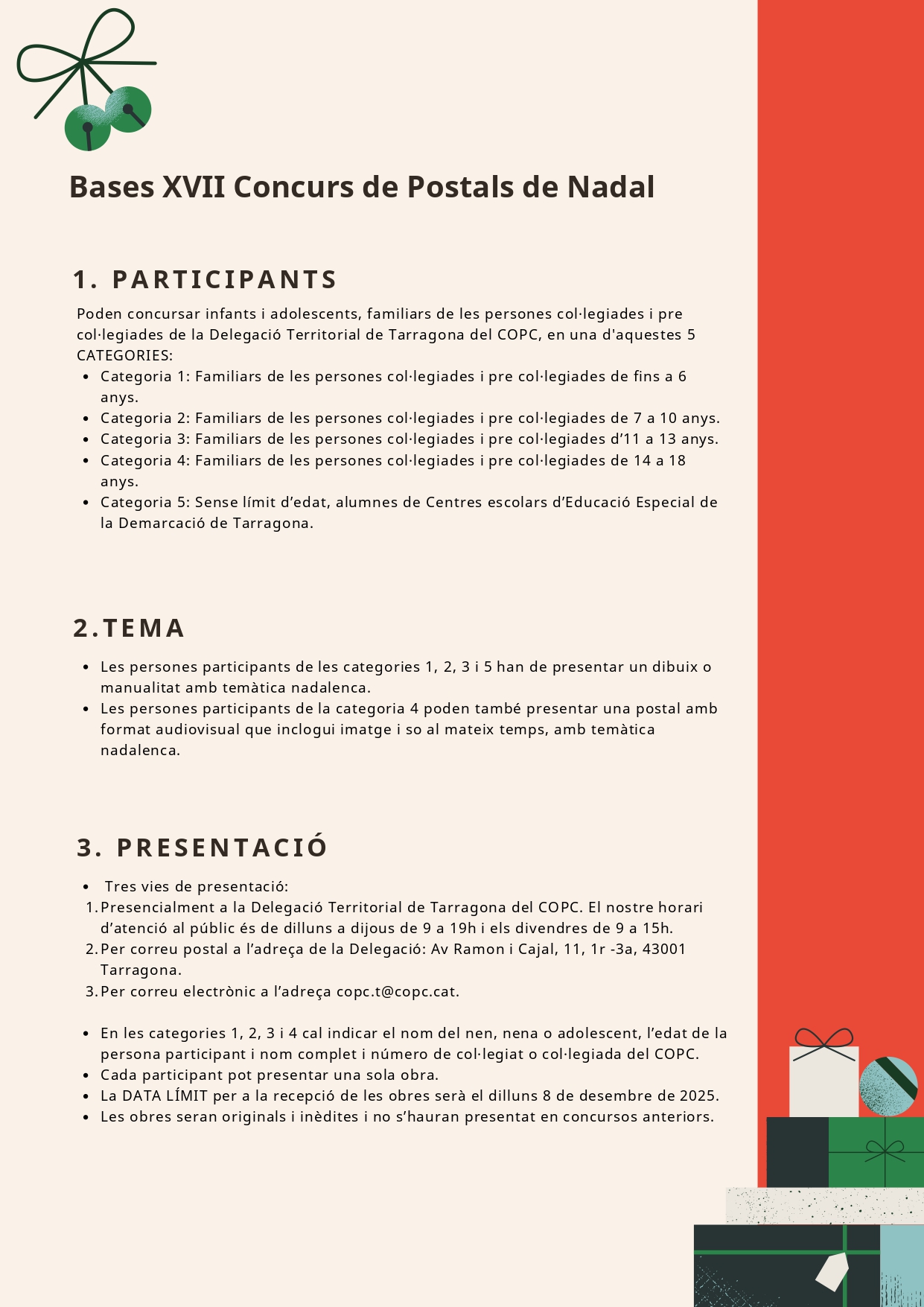 Com ja és tradició, quan s’acosten les dates de Nadal, organitzem el concurs de postals de Nadal per tal que els protagonistes de la felicitació de la Delegació Territorial de Tarragona del COPC siguin els menuts i joves artistes.