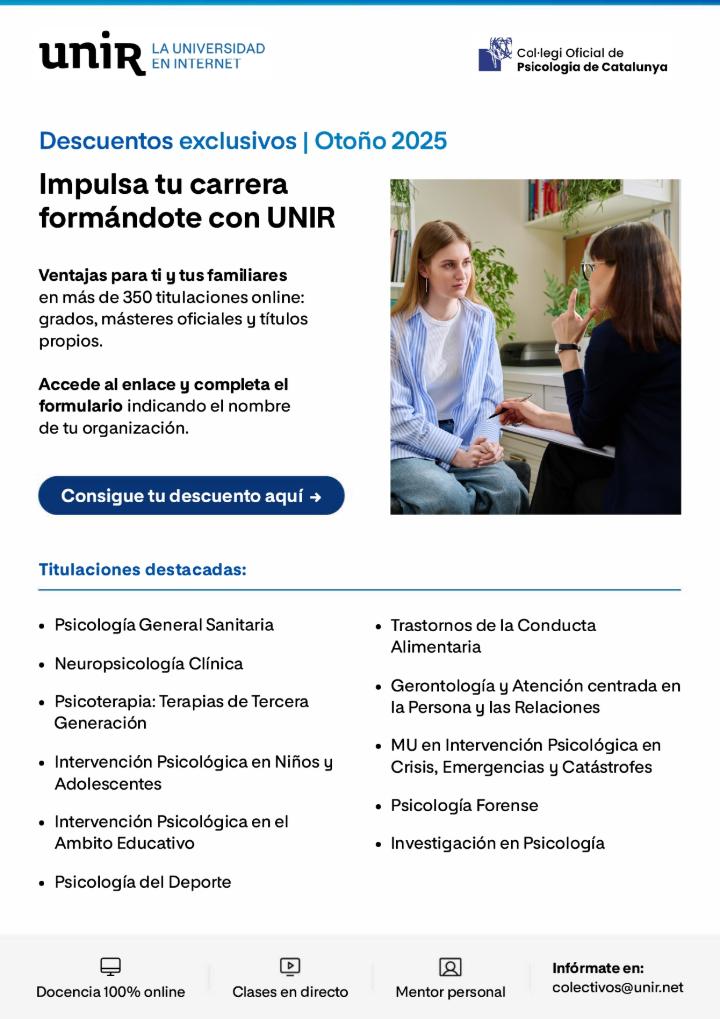 El Col·legi Oficial de Psicologia de Catalunya manté en vigor el conveni de col·laboració amb la Universidad Internacional de la Rioja (UNIR), universitat reconeguda per la seva oferta educativa en línia. Aquest acord permet als col·legiats i col·legiades del Col·legi, així com als seus familiars de fins a segon grau de parentesc, accedir a totes les titulacions de la UNIR - tant les directament relacionades amb la psicologia com aquelles que pertanyen a altres àmbits professionals - amb un descompte mínim del 20%.