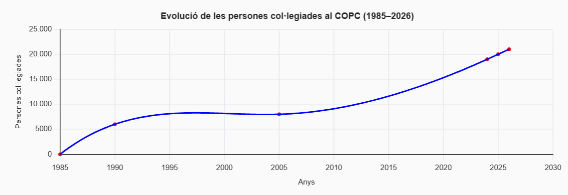 El temps necessari per sumar cada miler addicional s’escurça progressivament, fet que evidencia un creixement cada vegada més ràpid. De les 18.000 a les 19.000 persones col·legiades va passar un any, però el salt de 19.000 a 20.000 es va produir en deu mesos, i l’increment de 20.000 a 21.000 s’ha assolit en tan sols set mesos.
