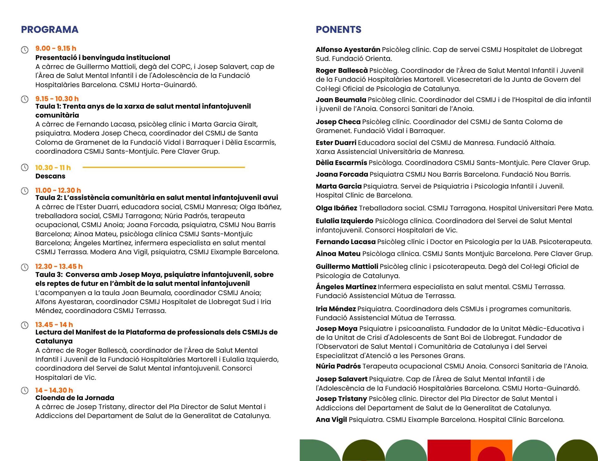 La jornada comptarà amb tres taules rodones dedicades a diferents aspectes de la salut mental infantojuvenil i culminarà amb la lectura del manifest de la plataforma de professionals dels CSMIJ de Catalunya, que es constituirà com a espai obert de participació per a tots els professionals interessats.