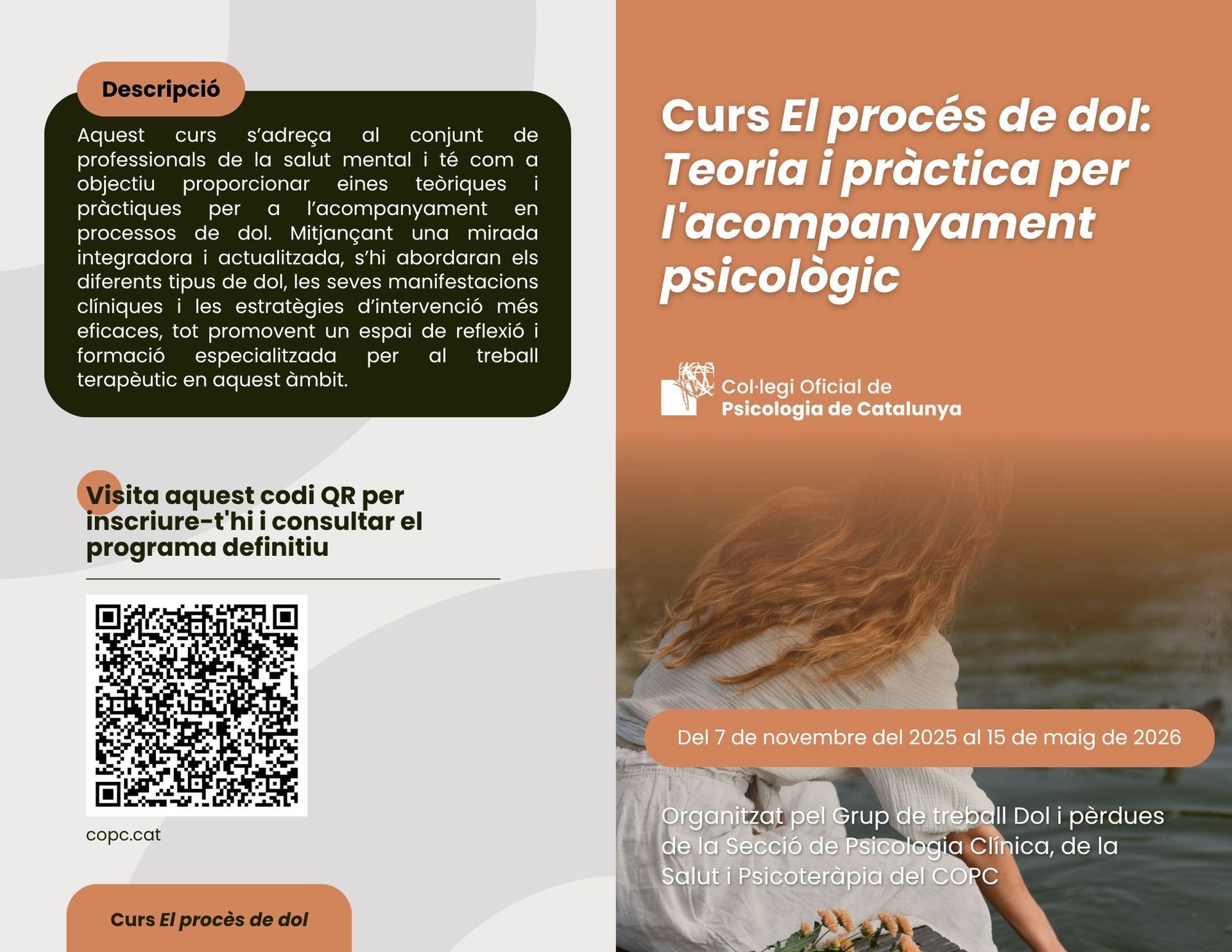 La formació, organitzada pel Grup de treball Dol i Pèrdues de la Secció de Psicologia Clínica, de la Salut i Psicoteràpia del COPC, tindrà lloc del 7 de novembre de 2025 al 15 de maig de 2026 en modalitat semipresencial. Té com a objectiu proporcionar eines teòriques i pràctiques per a l’acompanyament en processos de dol, tot promovent una mirada integradora i actualitzada.