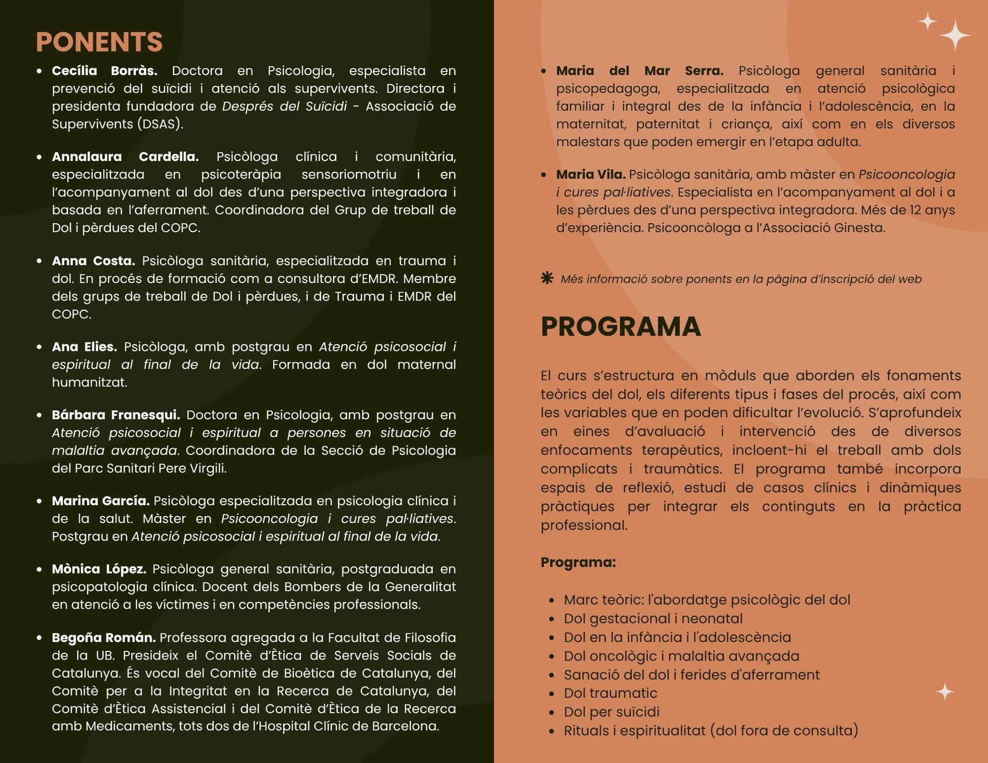 Les ponents són Cecília Borràs, Annalaura Cardella, Anna Costa, Ana Elies, Bárbara Franesqui, Marina García, Mònica López, Begoña Román, Maria del Mar Serra i Maria Vila, totes elles amb una àmplia trajectòria en l’àmbit del dol, la psicologia clínica i la bioètica.