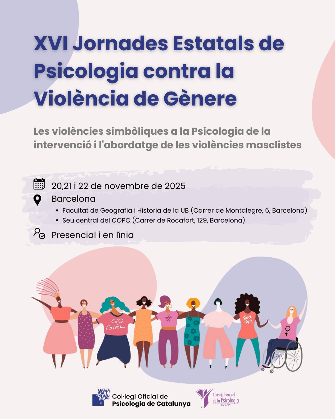 Les XVI Jornades Estatals de Psicologia contra la Violència de Gènere se celebraran del 20 al 22 de novembre de 2025 a Barcelona. L'esdeveniment, coorganitzat pel Consejo General de la Psicología de España i el Col·legi Oficial de Psicologia de Catalunya, a través de la Secció de Psicologia de les Dones, Gèneres i Diversitats, se centrarà en les violències simbòliques en la pràctica i intervenció psicològica davant les violències masclistes.