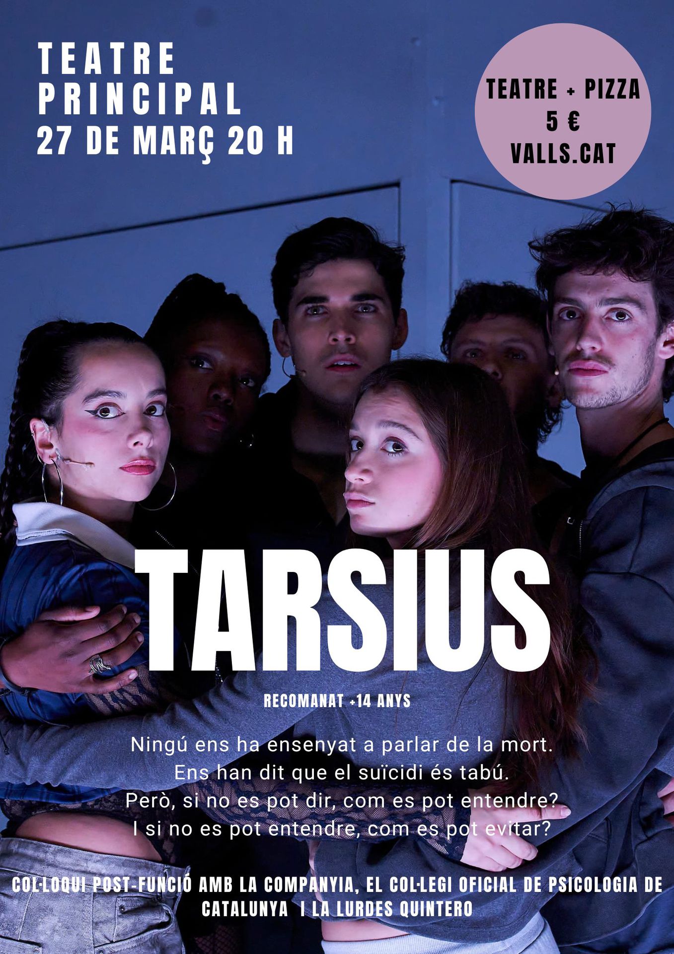 El pròxim divendres 27 de març a les 20 h, el Teatre Principal de Valls acollirà TARSIUS, una proposta escènica que aborda el tabú social entorn del suïcidi i reflexiona sobre el malestar emocional en la joventut. L’obra parteix d’una pregunta impactant: "Ningú ens ha ensenyat a parlar de la mort. Si no es pot dir, com es pot entendre? I si no es pot entendre, com es pot evitar?”