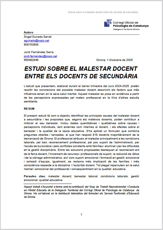 La Delegació Territorial de Girona del Col·legi Oficial de Psicologia de Catalunya (COPC), acaba de publicar l'"Estudi sobre el malestar docent entre els docents de secundària", un treball que té per objectiu identificar tant les principals causes del malestar docent a secundària com les propostes que, segons els mateixos docents, poden contribuir a millorar el seu benestar.