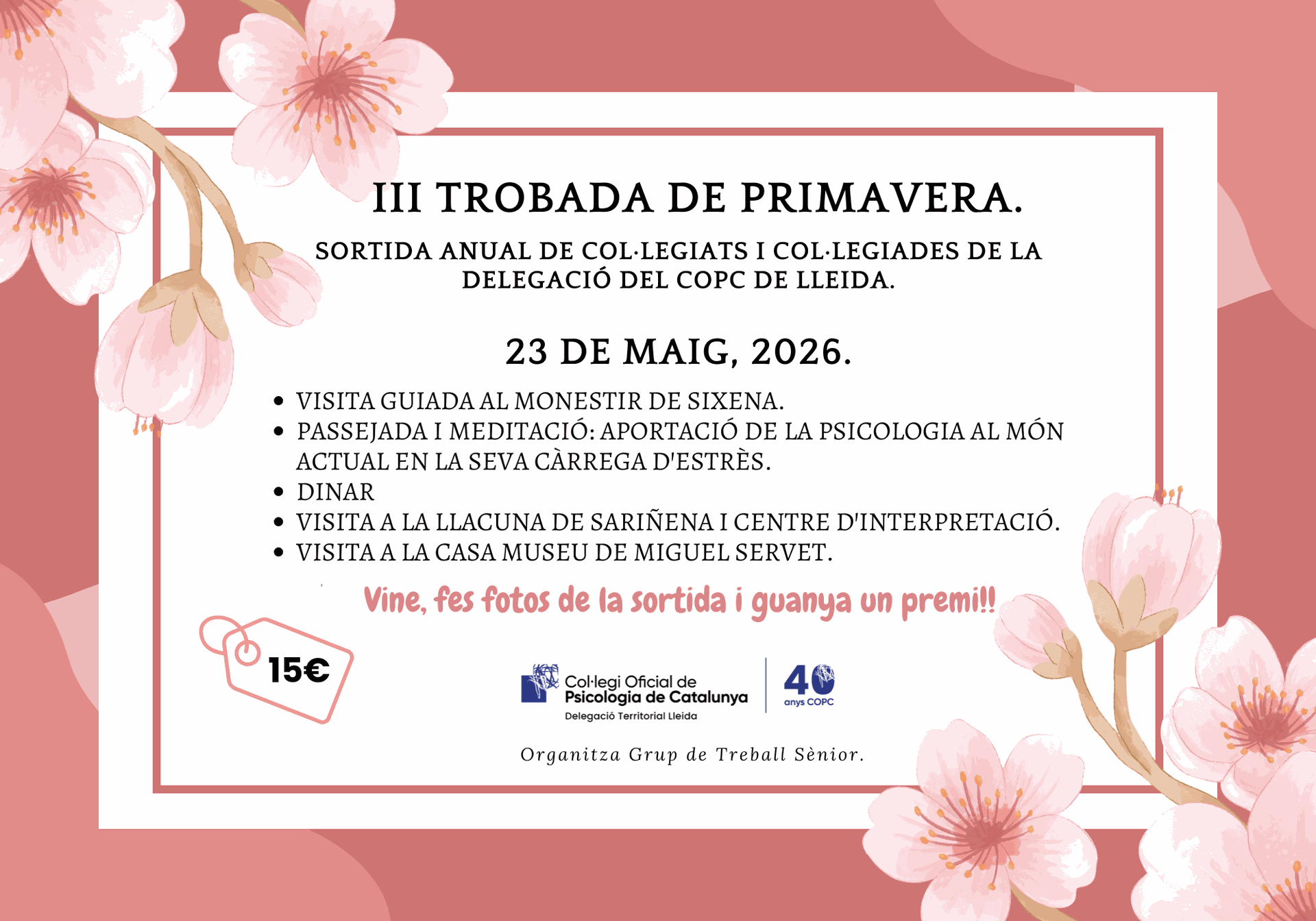 El Grup Sènior de la Delegació de Lleida del Col·legi Oficial de Psicologia de Catalunya anima les persones col·legiades i precol·legiades, així com les seves famílies i amistats, a participar en la Tercera Festa de Primavera, una proposta pensada com un espai de relació, trobada i celebració.