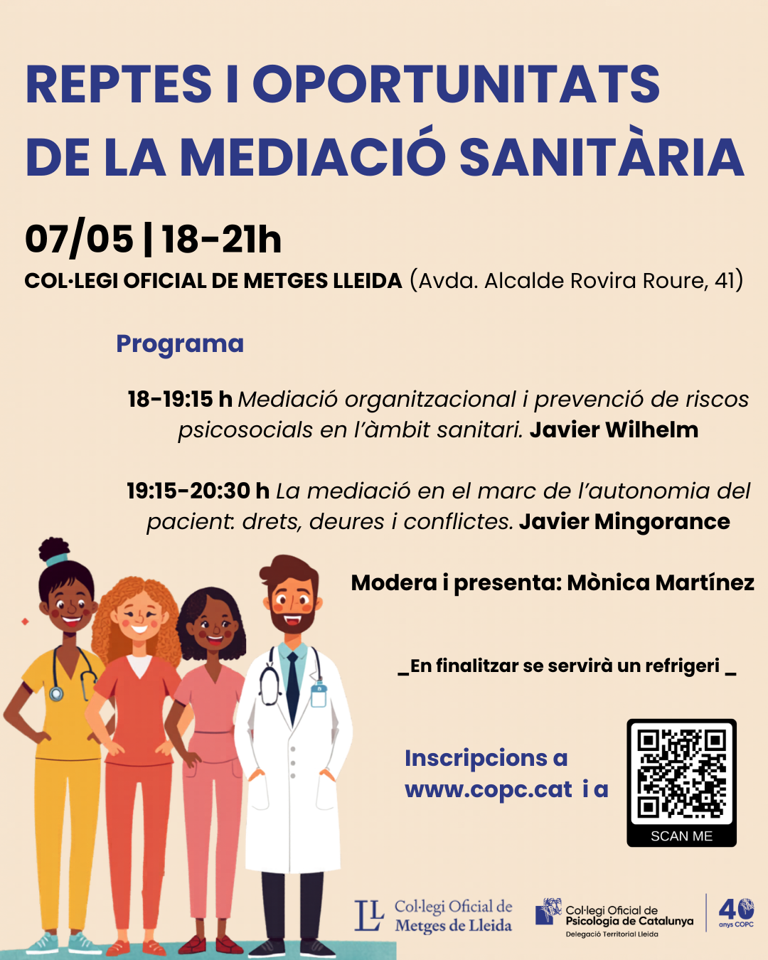 La Delegació de Lleida del Col·legi Oficial de Psicologia de Catalunya (COPC), en col·laboració amb el Col·legi Oficial de Metges de Lleida (COMLL), organitza el pròxim 7 de maig a les 18 h una sessió presencial dedicada a la mediació en l’àmbit sanitari, amb l’objectiu de fomentar espais de reflexió interdisciplinaris sobre la gestió de conflictes, la prevenció dels riscos psicosocials i el respecte als drets dels pacients.