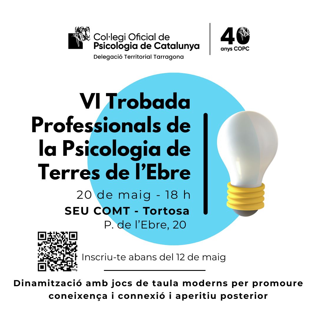 La Junta Rectora de la Delegación Territorial de Tarragona del COPC organiza el próximo miércoles 20 de mayo el VI Encuentro de Profesionales de la Psicología de Terres de l'Ebre. La Jornada pretende estrechar vínculos entre los y las profesionales de esta parte del territorio.
