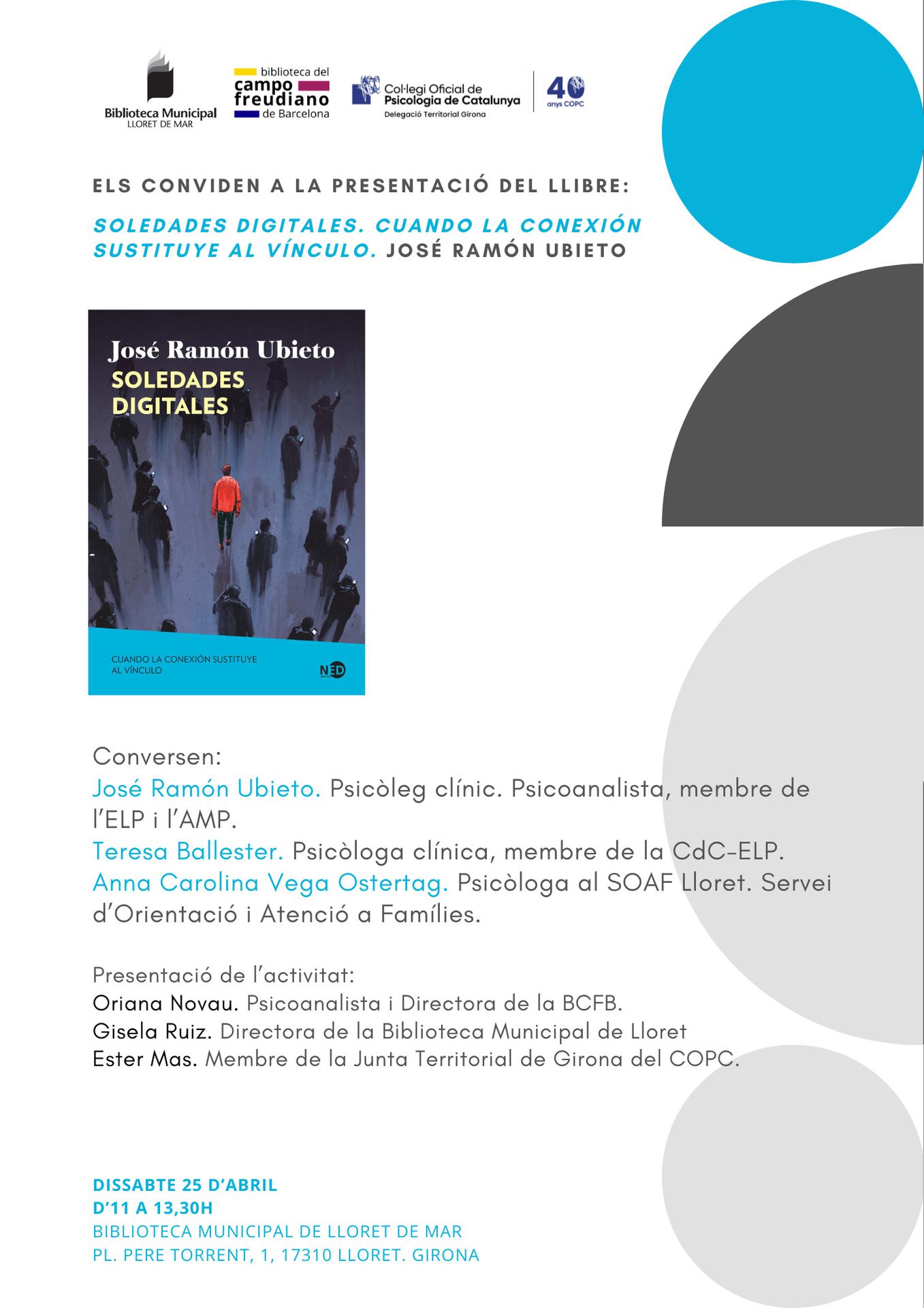 En aquesta activitat, l’autor del llibre José Ramón Ubieto, estarà acompanyat per les psicòlogues Teresa Ballester i Anna Vega, que oferiran una presentació sobre la lectura de l’obra des de la seva perspectiva professional.